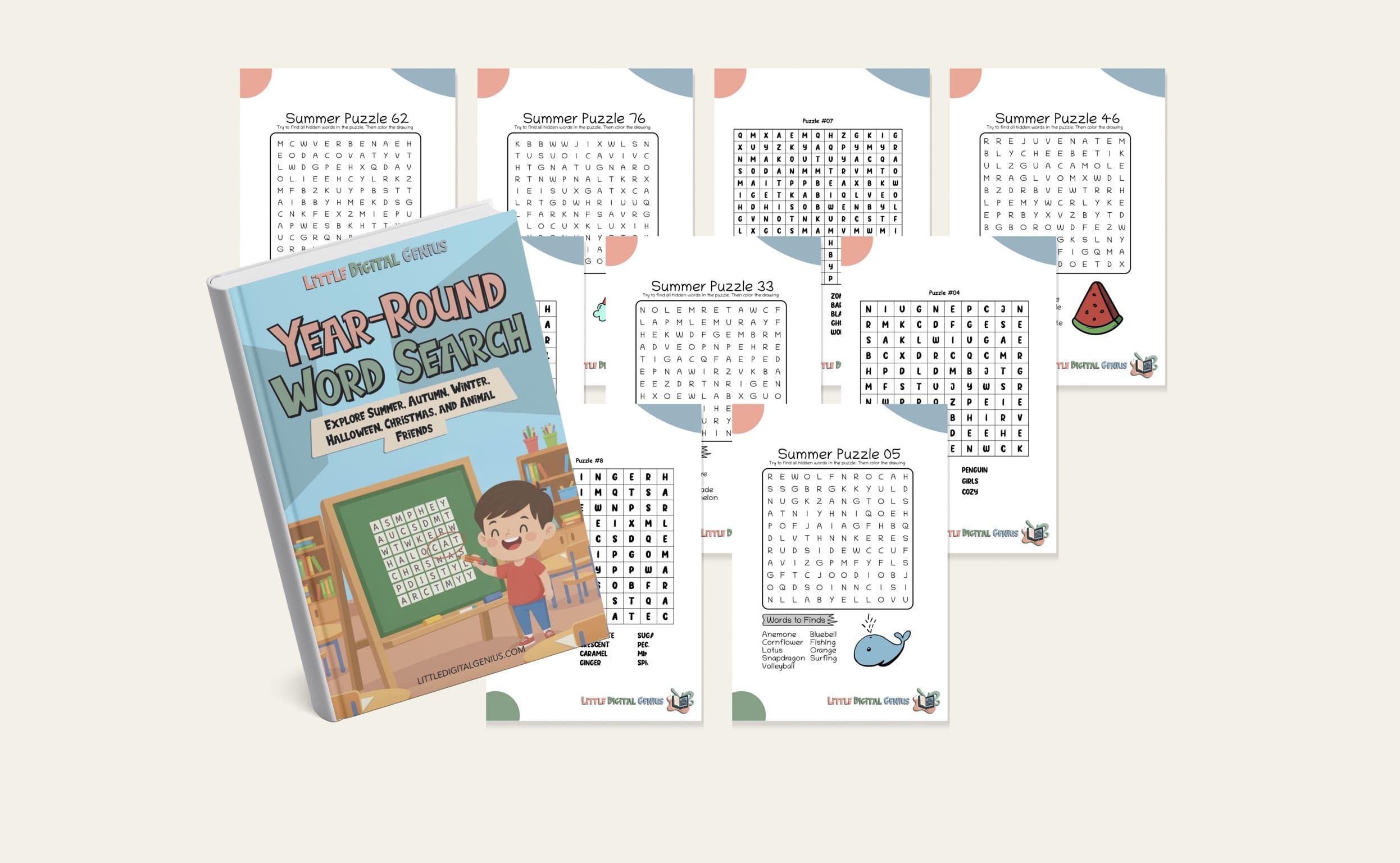 ✅ Summer Splash — Word searches about sunny beaches, ice cream, and vacation vibes. ✅ Autumn Leaves — Word searches with leaves, pumpkins, and back-to-school words. ✅ Winter Wonders — Word searches featuring snowflakes, scarves, and cozy cocoa. ✅ Halloween Fun — Friendly, not-too-spooky word searches with pumpkins and costumes. ✅ Christmas Cheer — Word searches with trees, gifts, and festive jingles. ✅ Animal Friends — Word searches with cute pets and wildlife, beginner-friendly vocabulary.